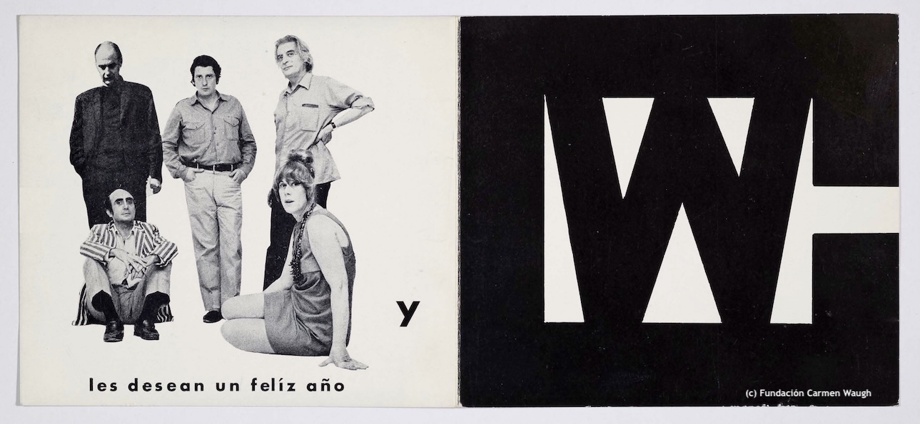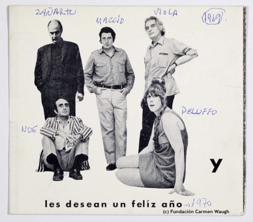 Tarjeta de saludo de fin de año 1969, con imagen de los artistas: Enrique Zañartu, Rómulo Macció, Viola, Marta Peluffo, Luis Felipe Noé. En reemplazo del grupo de artistas con obra